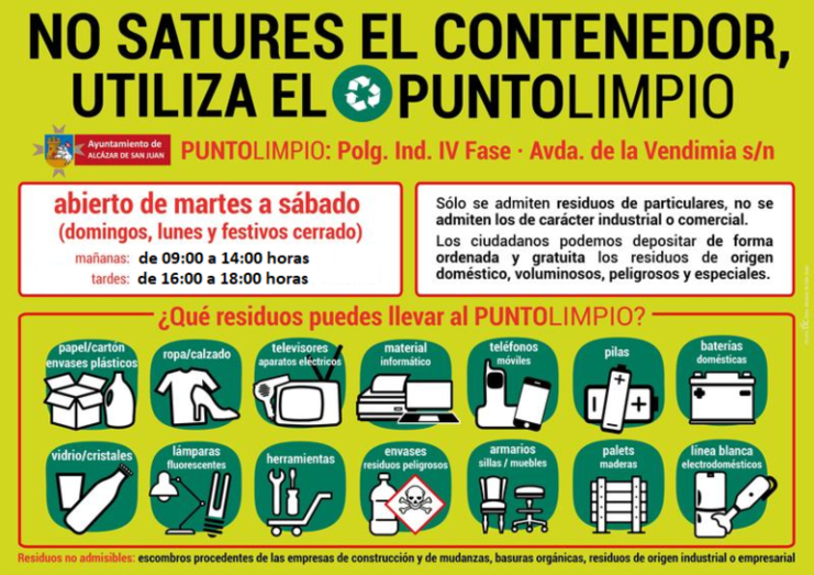 El ayuntamiento de Alcázar de San Juan, a través de la concejalía de Medio Ambiente pone en conocimiento que el Punto Limpio permanecerá cerrado los días sábado 27, domingo 28 y lunes 29 de marzo.