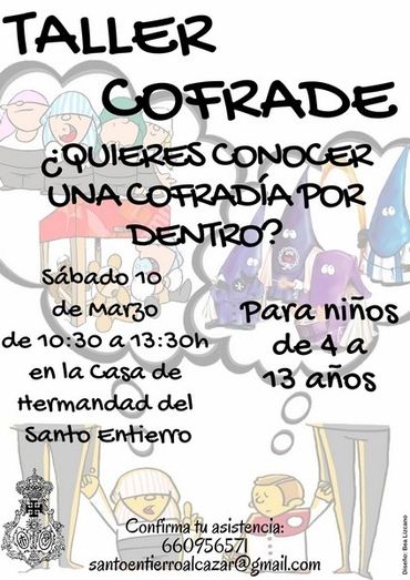 Este próximo sábado en las dependencias de nuestra Casa de Hermandad en la C/ Santa Ana nº 3 en horario de 10:30 a 13:30 h., tendrá lugar la I edición del taller Cofrade dirigido para niños de otras Cofradías que se encuentren entre los 4 y 13 años.