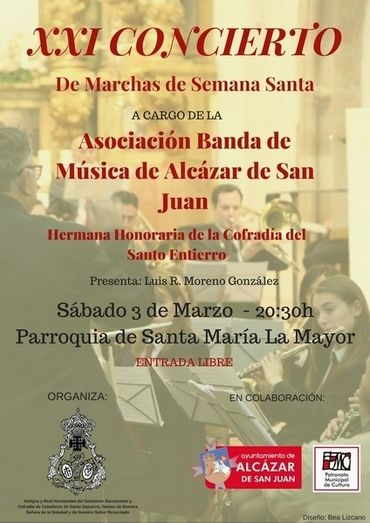 La cita será a las 20:30 horas en la Parroquia de Santa María La Mayor a cargo de la Asociación Banda de Música de Alcázar de San Juan (Hermana Honoraria de la Cofradía), dirigida por D. Luis Sánchez Romanos, con presentación de Luis Ramón Moreno González, poeta y escritor, miembro de la Cofradía del Santo Entierro.