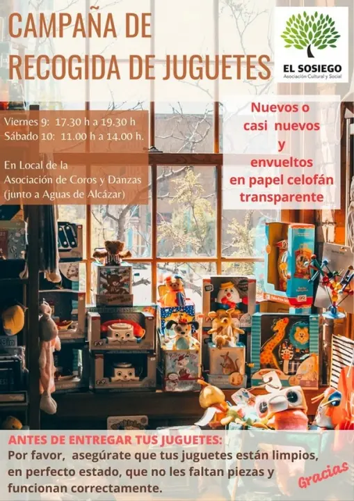 La Asociación cultural “El Sosiego” de Alcázar de San Juan ha retomado su tradicional campaña de recogida de juguetes, que se realizará este viernes 9 de diciembre, de 17.30 a 19.30 h., y el sábado, 10 de diciembre, de 11.00 a 14.00 h.