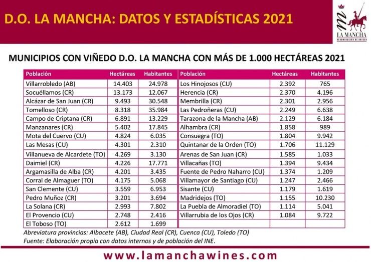 Del total de 154.893 hectáreas de viñedo de la DO La Mancha, la provincia de Ciudad Real (75.686 Ha y 6.445 viticultores) mantiene su músculo productor y en la actualidad tiene a seis municipios que superan las 5.000 hectáreas de viñedo inscrito en su término municipal: Socuéllamos (13.173 Ha), Alcázar de San Juan (9.343 Ha), Tomelloso (8.318 Ha), Campo de Criptana (6.891 ha) y Manzanares (5.402 ha). Tanto solo estas cinco localidades suman una población de 109.673 habitantes, según datos del INE en julio de 2021, lo que refleja el peso demográfico de la comarca manchega y la viticultura en la propia Comunidad Autónoma de Castilla-La Mancha (2.047.722. habitantes, según fuentes de datosmacro.com).