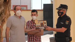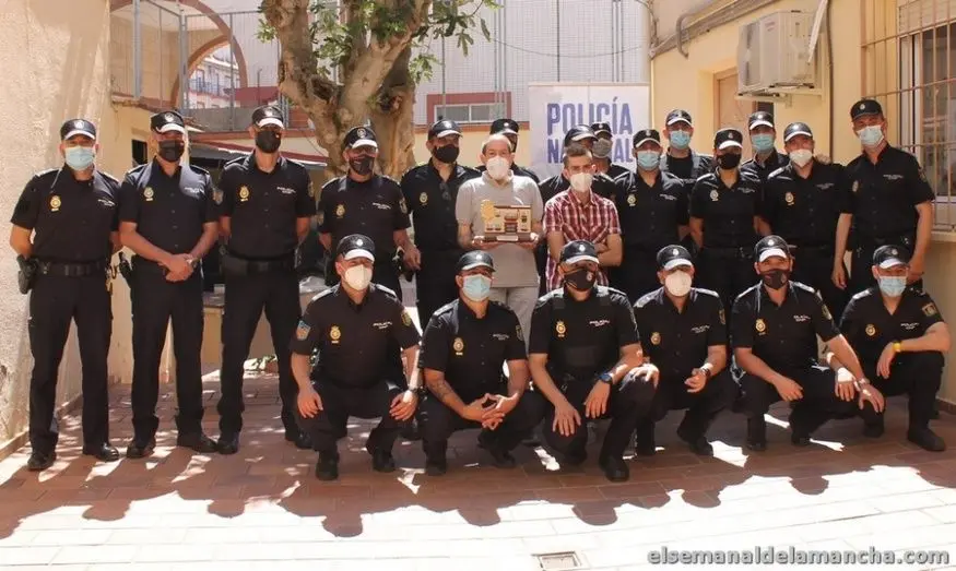 Acompañado por su hijo, el agente jubilado ha recibidote manos del comisario jefe, Julián Maroto, una escultura de la fachada de la Comisaría de Policía Nacional de Alcázar de San Juan.