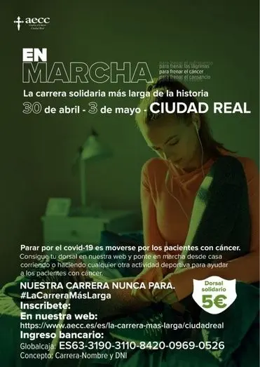 La Asociación Española contra el cáncer en la provincia de Ciudad Real, ha puesto en marcha una nueva iniciativa “Parar por el covid-19 es moverse por los pacientes con cáncer). Se trata de una carrera solidaria de 4 días en la que se puede participar adquiriendo un dorsal solidario por tan sólo 5 euros.