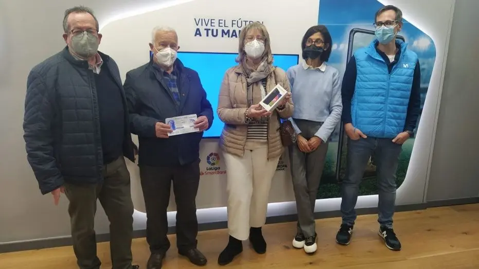 Mari Carmen Camacho ha sido este año la ganadora del primer premio de la rifa de San Sebastián, consiste en un teléfono Samsung Galaxy A52s 5G. En la fotografía, la agraciada recoge su premio junto a miembros de la junta directiva y representantes de Moises Mata.