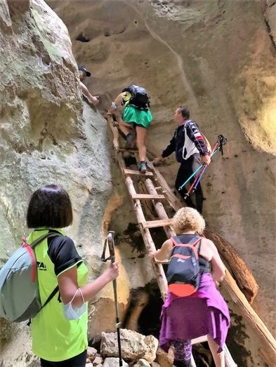 Salía el sol, la ruta y el paisaje, se presentaban ante nuestros ojos, espectacular, el recorrido, las vistas, la admiración de los participantes. Y como en todas nuestra rutas está ese punto de aventura y diversión que intentamos que haya y que no sea demasiado difícil para que tod@s lo senderistas lo puedan realizar sin problemas y con ayuda de los demás, pues…, la ruta se estrechó y para acceder a otras alturas tuvimos que subir por un tronco colocado a moda escalera y por unas escaleras hechas de madera. También atravesamos un arroyo pisando de piedra en piedra, alguno se mojó un poquito las zapatillas, pero todos/as, absolutamente, lo pasamos genial.
