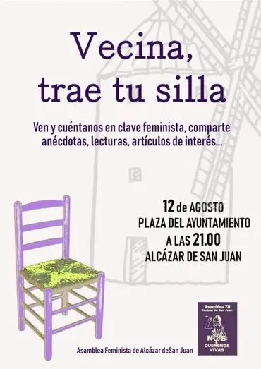 La Asamblea Feminista 7N Alcázar invita a participar en una acción de calle diferente y manchega. a partir de las 21 horas, recupera la tradición de sentarte al fresco con vecinos