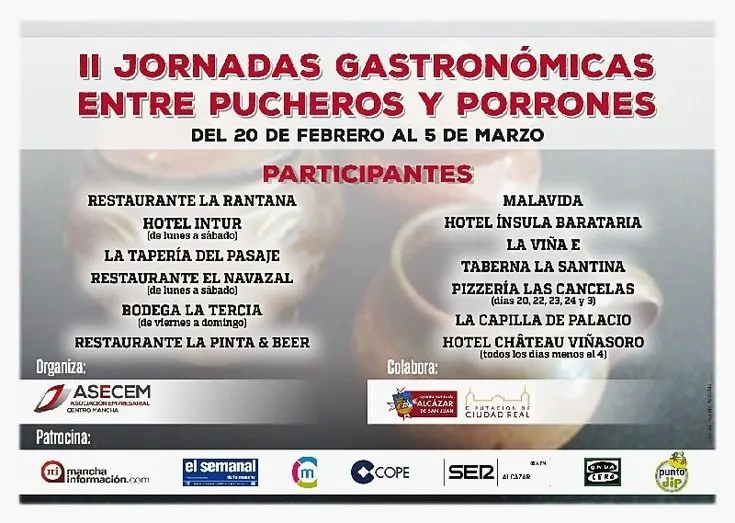 Según el portavoz de ASECM, Arturo García-Casarrubios, cada establecimiento tiene libertad para ofrecer en una cazuela de barro aquél guiso tradicional de la cocina mediterránea que más le guste, de perdiz, bacalao con patatas, lentejas, etc, en una ración para dos personas al precio de 2,50 euros. Además, en la barra del establecimiento habrá porrones, buscando recuperar este objeto, para que los clientes tomen un trago del vino que se ofrezca en cada uno, pero siempre de la D.O. La Mancha.