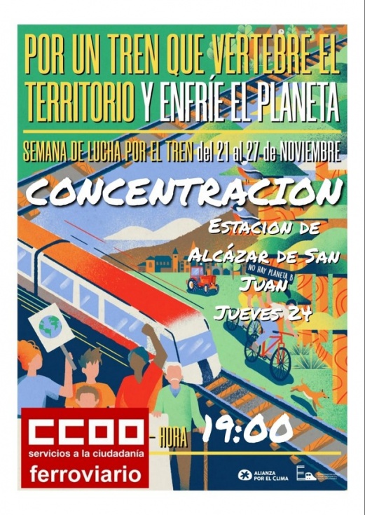 La coordinadora local de Izquierda Unida de Alcázar de San Juan ha registrado, para su debate y aprobación en el próximo Pleno ordinario del ayuntamiento, una moción por un TREN QUE VERTEBRE EL TERRITORIO Y ENFRÍE EL PLANETA y en este contexto, IU anima a toda la ciudadanía a participar en la concentración convocada por la Coordinadora Estatal por el Tren Público, Social y Sostenible dentro de la Semana de Lucha por el Tren y que tendrá lugar este jueves 24 de noviembre a las 19:00 horas, en la estación de tren de Alcázar.