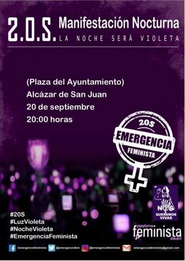 Este viernes, día 20 de septiembre, el colectivo Espinas, la Plataforma abolicionista de Ciudad Real y la Asamblea feminismos, atendiendo a la convocatoria nacional y junto a las más de 200 ciudades españolas, saldrán a la calle, llamadas por la situación de 'emergencia feminista', para iluminarlas de violeta. “Nos unimos para iluminar la noche de ciudades de toda España de violeta para reclamar medidas y medios para luchar contra la violencia machista y construir una sociedad en la que las mujeres vivan seguras”.