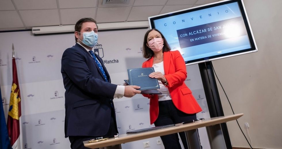 El consejero de Fomento, Nacho Hernando, ha firmado este lunes en Toledo, junto con la alcaldesa de Alcázar de San Juan, Rosa Melchor, el convenio de cesión de seis viviendas y un local en el barrio de La Pradera’, en un acto al que también han asistido la directora general de vivienda, Inés Sandoval; y el vicepresidente segundo de la Diputación de Ciudad Real, Gonzalo Redondo.