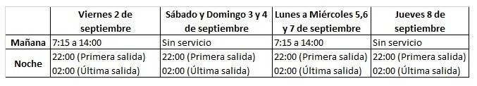 El sábado, 3 y el domingo, 4 de septiembre, por la mañana no habrá servicio y por la noche tendrá el mismo horario de 22:00 horas a 2:00 horas,