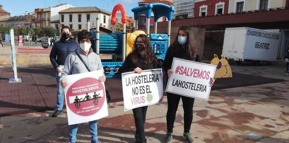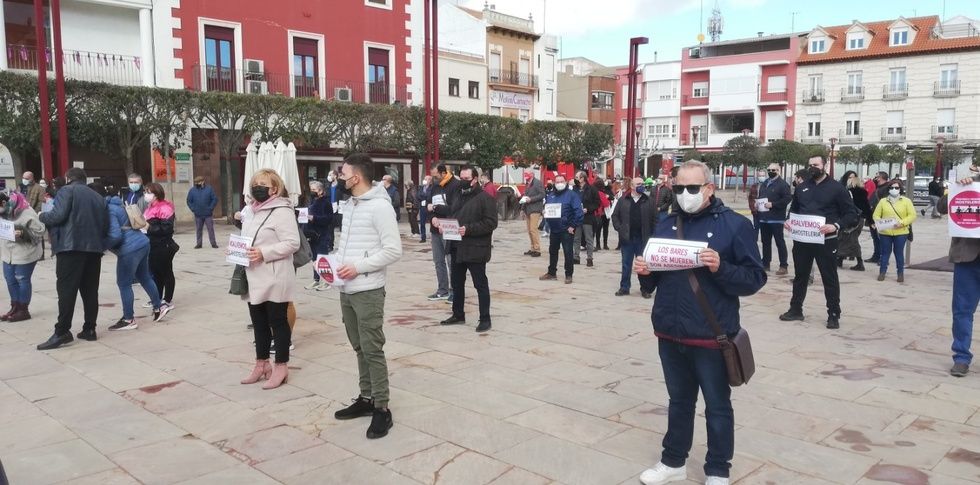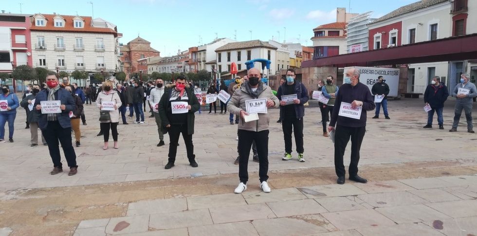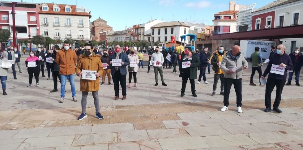 Un centenar aproximado de hosteleros y pequeños comerciantes de Alcázar de San Juan y comarca ha participado esta mañana en una concentración, organizada por ASECEM (Asociación Empresarial Centro Mancha), para protestar contra la complicada situación que atraviesa el sector y exigir a los gobiernos regional y central "un plan de rescate digno", pues consideran que las restricciones y medidas impuestas por las autoridades sanitarias para frenar la pandemia "están llevando a nuestras familias y negocios a la ruina".