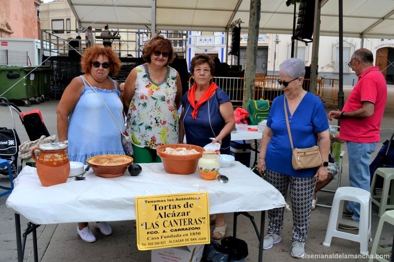 La asociación de encajeras "El Torreón", con su presidenta Angelita Quiralte al frente, están siendo las protagonistas, elaborando en directo la bizcochá y con un pequeño puesto instalado con la colaboración de la empresa local de tortas de Alcázar, Las Canteras.