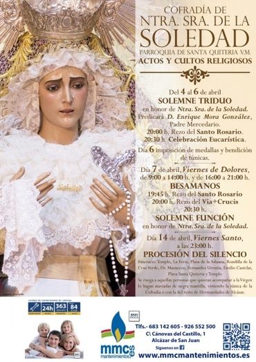 Quedan invitados a estos cultos los devotos de Nuestra Señora de la Soledad, así como autoridades, asociaciones y pueblo en general de Alcázar de San Juan.