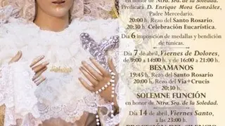 El Viernes de Dolores tendrá lugar a las 20:30 la Solemne Función en honor a Nuestra Señora de la Soledad, que estará expuesta en devoto besamanos durante todo el día (de 9 a 14 horas y de 16 a 21 horas). Ese día se rezará un Vía+Crucis a las 20 horas, precedido del Santo Rosario a las 19:45.