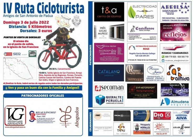 La asociación Amigos de San Antonio de Padua de Alcázar de San Juan ha organizado lo que será su IV Ruta Cicloturista, que se desarrollará el domingo 3 de julio a partir de las 09:30 horas, con salida a las 10:00horas desde la puerta de la Iglesia de San Francisco.