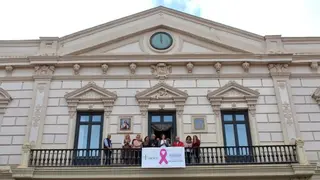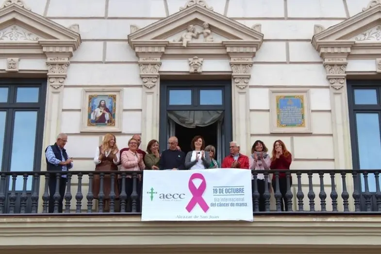 La alcaldesa de Alcázar de San Juan, Rosa Melchor, y miembros de su equipo de Gobierno, acompañaron a los representantes de la agrupación alcazareña de la AECC en la colocación de la banderola con motivo de la celebración del Día Internacional del Cáncer de Mama. El balcón principal del edificio consistorial muestra un gran lazo rosa, símbolo de la lucha contra esta enfermedad.