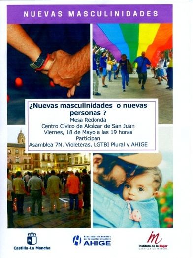 La Mesa Redonda de Alcázar de San Juan será el viernes, 18 de Mayo, a las 19 horas, en el Centro Cívico de Alcázar de San Juan, y estará formada por la Asociación 7N, la Asociación Las Violeteras, Plural-LGTBI de Alcázar y AHIGE-CLM, que debatirán acerca de “¿NUEVAS MASCULINIDADES O NUEVAS PERSONAS?” Esperamos que el tema sea de vuestro interés y os pedimos que le deis la máxima difusión. Contamos con vuestra presencia. Muchas gracias.