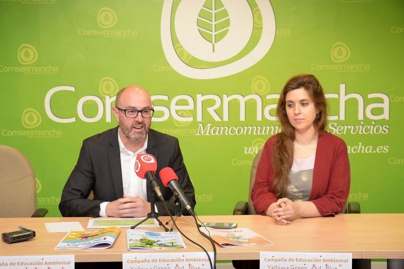 El presidente de la Mancomunidad de Servicios Comsermancha, Pedro Ángel Jiménez, ha presentado este miércoles, en la sede de la Mancomunidad en Alcázar de San Juan, junto a la representante de la empresa Opportunity Green, Natalia Ortega, la campaña de concienciación y reciclaje en inglés: ‘Yellow, green and blue, you can recycle too!’; que a través de unos 250 talleres llegará a 5.240 escolares de 3º de Infantil, 4º y 5º de Primaria de los 21 pueblos y las dos entidades menores que conforman la Mancomunidad.