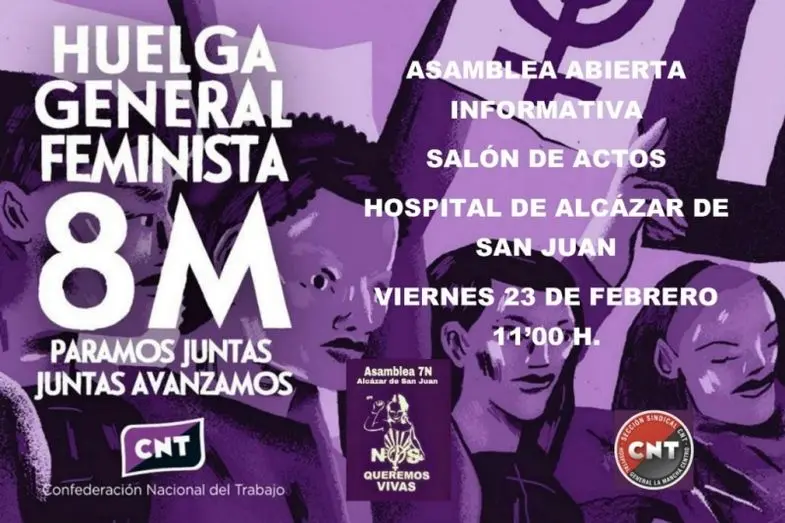 La Sección Sindical de la Confederación Nacional del Trabajo (CNT) ha convocado una Asamblea Abierta Informativa sobre la huelga general feminista del 8 de marzo, asamblea que tendrá lugar este viernes, 23 de febrero, a las 11:00 horas en el Salón de Actos del Hospital General La Mancha Centro de Alcázar de San Juan