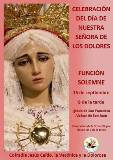La junta de gobierno de la Cofradía de la Cofradía ha informado de los actos programados con motivo de la festividad de la Virgen de los Dolores, que se conmemora el próximo día 15 de septiembre. Éstos serán en la iglesia de San Francisco, con veneración a la Virgen a partir de las siete de la tarde y la celebración de la función solemne a las ocho.