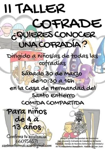 Este sábado en la casa de Hermandad de la Calle Santa Ana nº 3 de Alcázar de San Juan, en horario de 10:30 a 16:00 h., tendrá lugar la II edición del taller Cofrade dirigido para niños/as de todas las Cofradías qcon edades comprendidas entre los 4 y 13 años. Como novedad este año se realizará una comida compartida entre los asistentes.