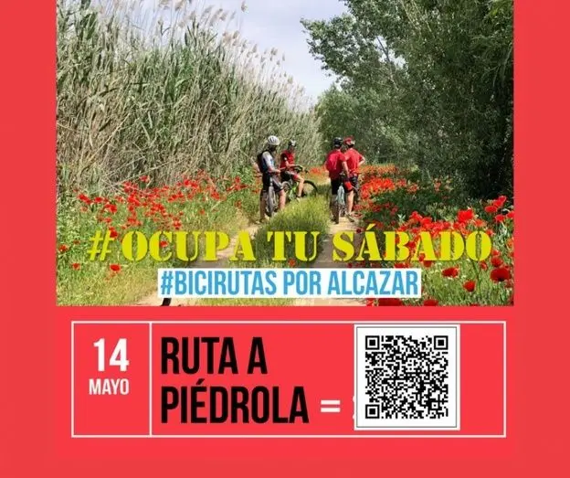 Para el día 14 también se ha organizado #bicirutas por alcazar, en este caso se quiere llegar a Piédrola con un recorrido de 22 kilómetros. Esta actividad está dirigida a jóvenes de 13 a 20 años. Comenzará a la 10 de la mañana, tiene una duración de dos o dos horas y media y el punto de encuentro es en la máquina del tren.