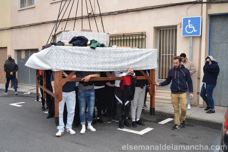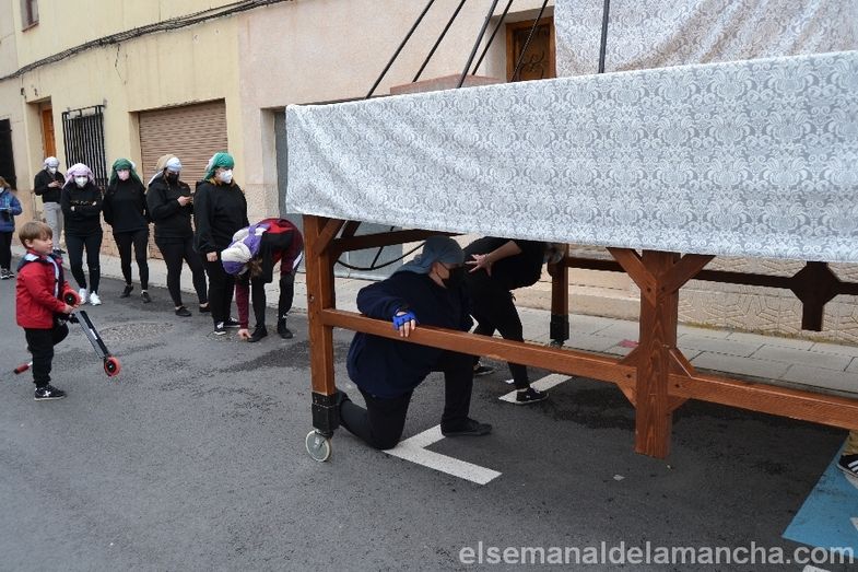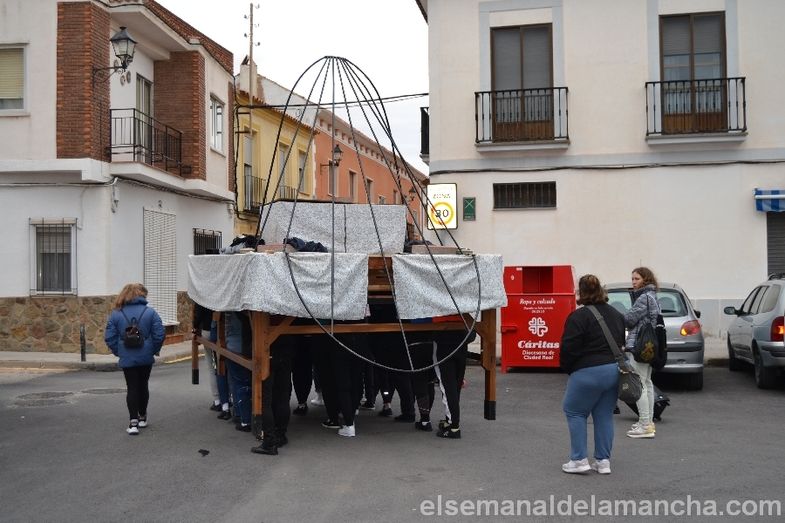 Semana Santa 2022. Después de una pandemia sin procesiones (retomadas en octubre, con la procesión de la patrona, la Virgen del Rosario), los costaleros y costaleras de la Cofradía de Caballeros del Santo Sepulcro y Damas de Nuestra Señora de la Soledad (Parroquia de Santa María) han vuelto a la calle, para ensayar por primera vez este año e intentar "volver a la normalidad" de la mejor forma posible. El ensayo iba a ser anoche, pero debido al tiempo se ha celebrado en la tarde del sábado.