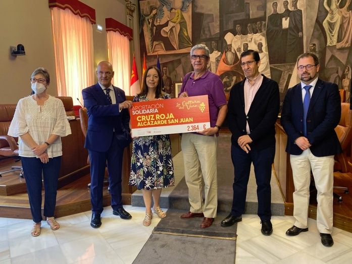 La alcaldesa, Rosa Melchor, el presidente de la Diputación de Ciudad Real, José Manuel Caballero, y el vicepresidente y concejal del Ayuntamiento de Alcázar de San Juan, Gonzalo Redondo, fueron los encargados de entregar el cheque simbólico con la recaudación obtenida, al tesorero de Cruz Roja Alcázar de San Juan, Víctor Cerezuelo.