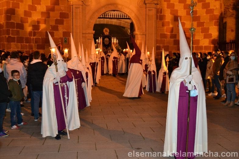 Cientos de personas se dieron cita anoche en la plaza del Altozano para ver la primera procesión de Semana Santa en Alcázar de San Juan. Después de dos años de espera y alrededor de las 10 de la noche, las puertas de San Francisco se abrieron de par en par para dejar salir a la imagen de La Dolorosa, portada por los costaleros de la Cofradía de Jesús Caído, la Verónica y la Dolorosa e iniciar así el primer desfile procesional de la Semana Santa 2022 alcazareña.