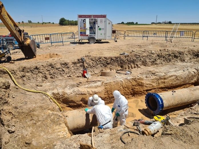 La empresa Aguas de Alcázar de San Juan realizó ayer una intervención, a las 07:00 horas, cuando se iniciaban los trabajos para realizar una intervención programada en la tubería general de abastecimiento, a unos 5 km de la población y muy cerca del Camino de Guerra. El objeto principal de esta intervención era sustituir la válvula 6, que ha quedado inutilizada por obsolescencia. Al mismo tiempo se ha aprovechado para cambiar también la ventosa 12 y la Te de inserción de ésta en la general, que estaba muy deteriorada por oxidación, y para instalar un nuevo desagüe que facilitará las futuras labores de mantenimiento en este tramo.
