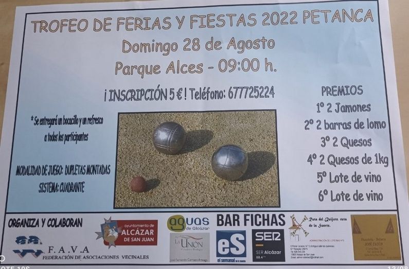 La Federación de Asociaciones de Vecinos de Alcázar, FAVA, ha organizado una nueva edición del Trofeo de Feria y Fiestas de Petanca, y lo ha hecho recordando al anterior presidente de la Federación, Tomás Ramos Castellanos, “gran amigo que se desvivía por este Torneo, con gran solera y que se suele celebrar unos días antes de la Feria”, tal como ha señalado el presidente, Antonio Fernández.