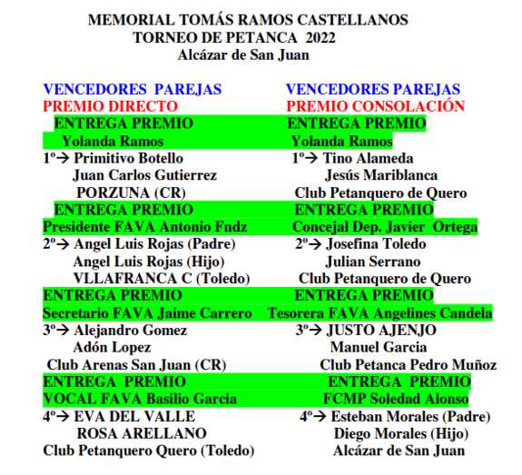 La Federación de Asociaciones de Vecinos de Alcázar de San Juan (FAVA) celebró ayer domingo con gran éxito de participación, el Torneo de Feria 2022 de Petanca Memorial Tomás Ramos (presidente de la federación fallecido durante la pandemia). Un Torneo que convocó en el parque Alces a más de 150 personas, con 48 parejas inscritas y gran expectación, dedicado en esta ocasión a la memoria del anterior presidente de la FAVA.