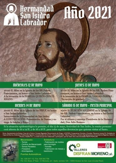 La Hermandad de San Isidro Labrador de Alcázar de San Juan ha programado una serie de actos religiosos en honor al patrón de los agricultores, cuya festividad se celebrará el día 15 de mayo. Este año, debido a la pandemia, la Hermandad y el Ayuntamiento han decidido suspender la tradicional romería, así como todos los actos que puedan provocar aglomeraciones, atendiendo a las recomendaciones sanitarias, pero sí se celebrarán los actos religiosos.