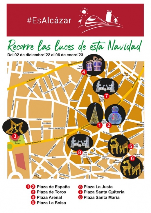Además, habrá elementos iluminados no sólo en la Plaza de España, sino también en otras seis plazas, dando lugar a una iluminación extraordinaria en zonas como las Plazas de la Bolsa y la Justa; en las entradas a Santa Quiteria y Santa María, donde habrá belenes iluminados; grandes paquetes, en El Arenal; o la estrella de la plaza de toros.