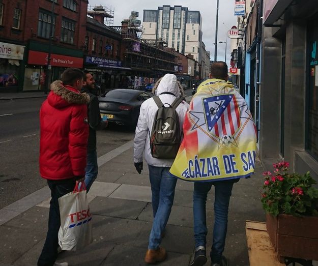 Cinco miembros de la peña Corazón de La Mancha están presentes en Liverpool en el día de hoy paseando con orgullo el nombre de Alcázar de San Juan por toda la ciudad inglesa, como puede verse en la fotografía que nos han enviado mientras aguardan el partido.