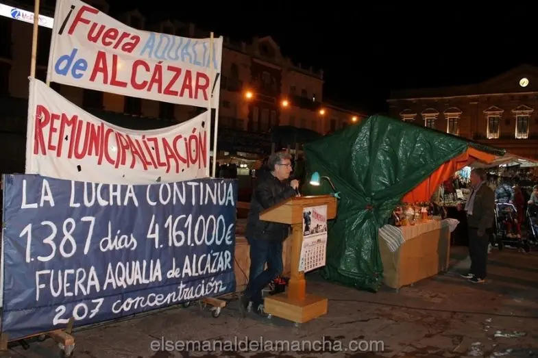 La Plataforma contra la privatización de Aguas de Alcázar ha celebrado hoy su habitual concentración de los viernes en la Plaza de España en favor de la remunicipalización, coincidiendo en esta ocasión con la apertura del mercado cervantino que se ha instalado en el centro de la ciudad y con un pasacalles de personajes quijotescos, dentro del programa de actividades de las Jornadas “Vino y Bautismo Cervantino”.