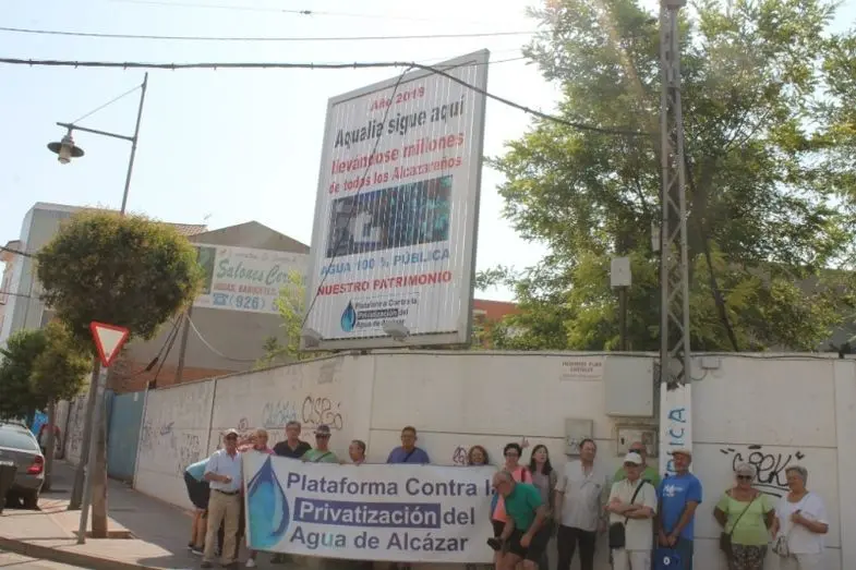 La Plataforma en contra de la Privatización de Aguas de Alcázar ha puesto en marcha, este jueves, una campaña de de información y denuncia a través de una valla publicitaria situada en la Avenida de Herencia, frente a la salida de vehículos de Aguas de Alcázar, en la que con tres imágenes que van a apareciendo en la valla se hace un repaso de lo ocurrido con Aguas desde 2014.