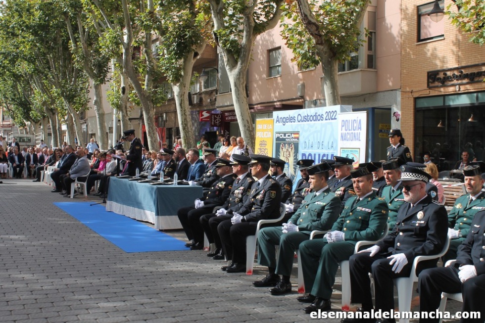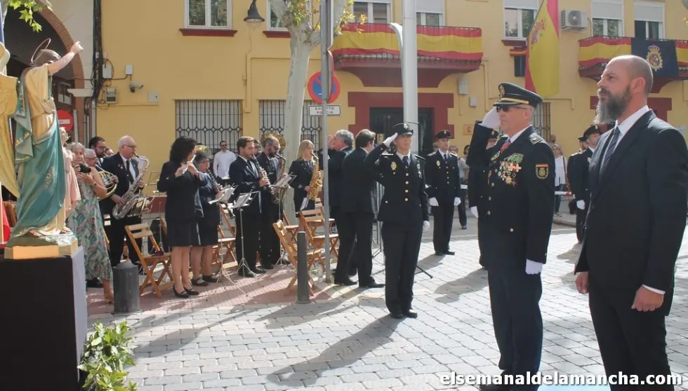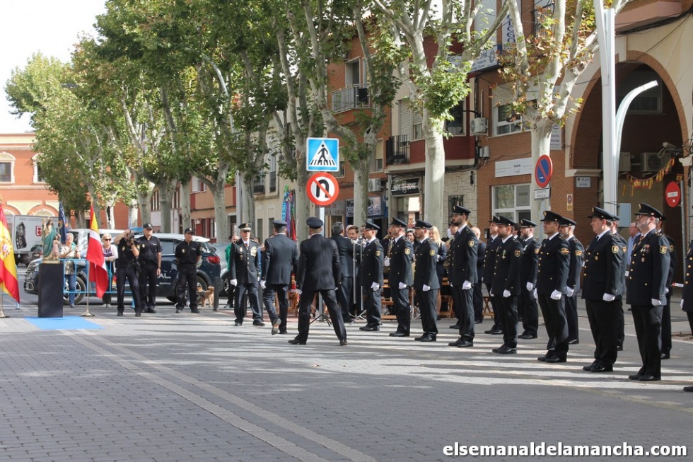 La Policía Nacional de Alcázar de San Juan ha celebrado este martes, a las puertas de su Comisaría, el acto oficial de la festividad de sus patrones, los Ángeles Custodios, un acto que ha estado repleto de reconocimientos, menciones especiales y un homenaje a los caídos de azul con una corona de laurel en los que han estado presentes los agentes nacionales, locales, Guardia Civil, autoridades y buena parte de la sociedad civil alcazareña invitada a este evento, que ha terminado junto a la comisaría con una vino español.
