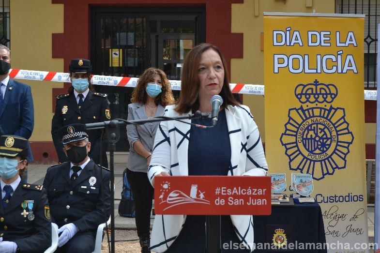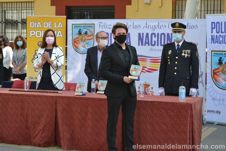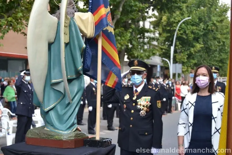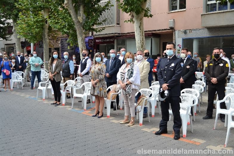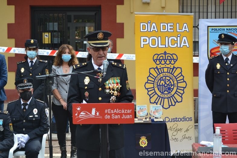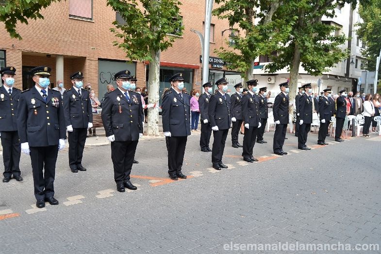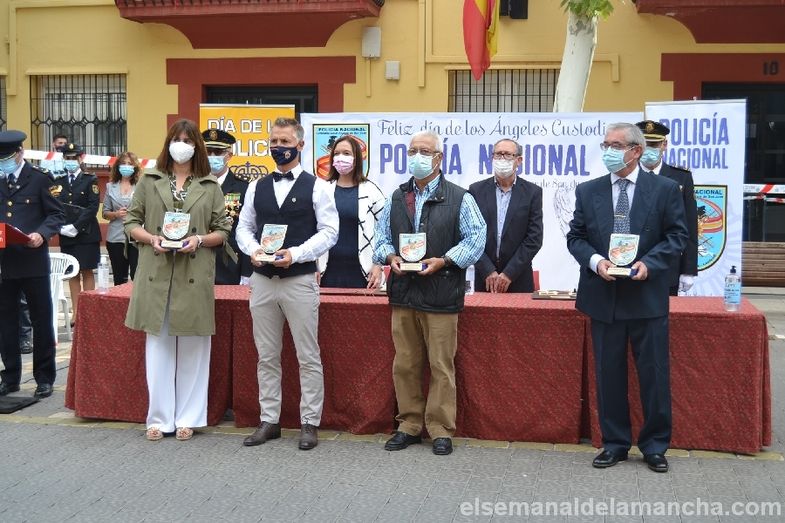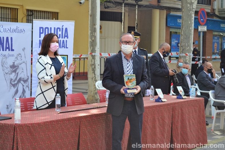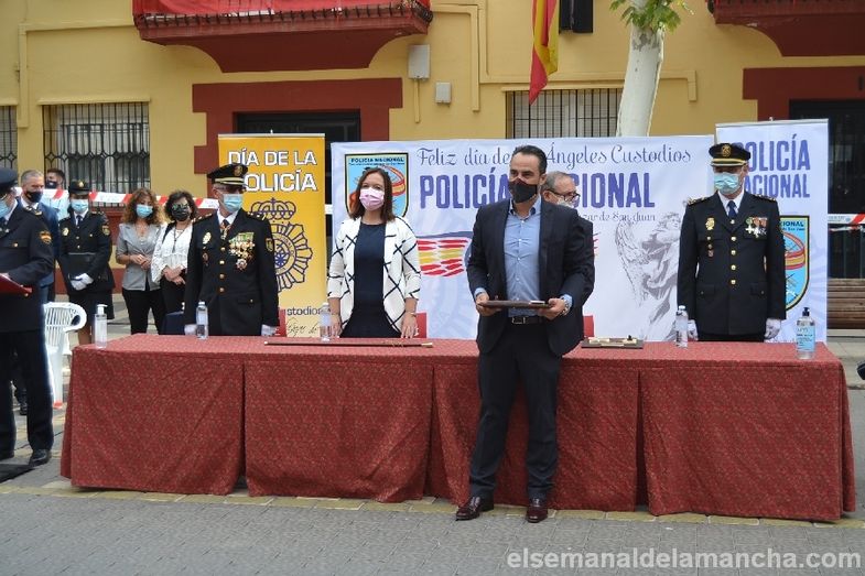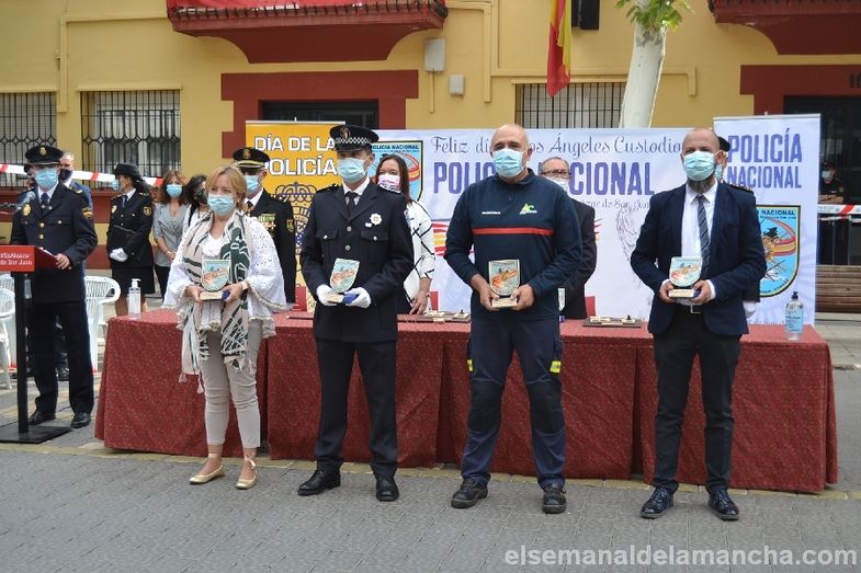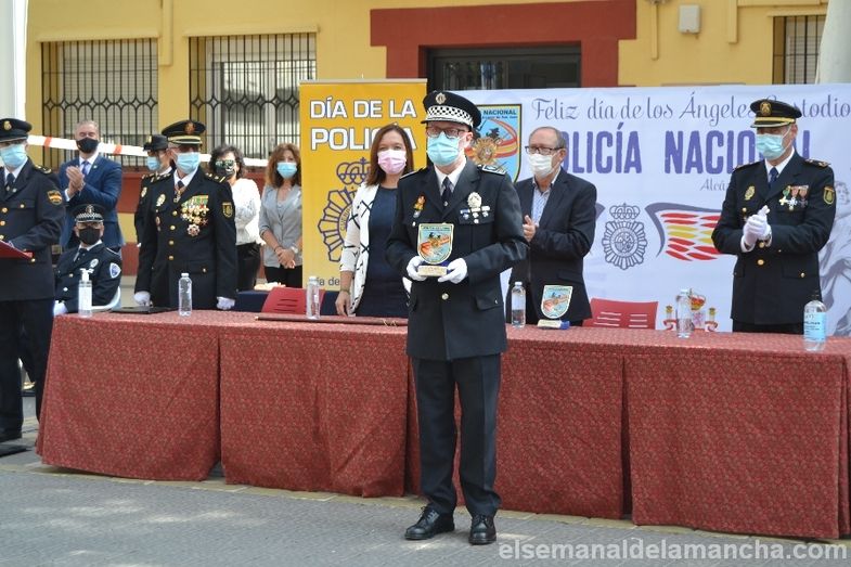La Comisaría de Policía Nacional de Alcázar de San Juan se ha sumado esta mañana a los actos celebrados en toda España con motivo de la festividad de los Santos Ángeles Custodios, patrón del Cuerpo. En esta ocasión como novedad, el acto se ha celebrado en la calle, con mascarillas y distancia de seguridad, delante de la propia Comisaría. El desarrollo ha sido similar al de años anteriores, en cuanto a entrega de condecoraciones y reconocimientos civiles, pero el enfoque ha girado en torno a la pandemia, convirtiendo la celebración en un homenaje a las víctimas, a los sanitarios, a los cuerpos de Seguridad, al personal esencial y a las muchas personas que han sabido afrontar la lucha contra el Covid desde la responsabilidad, el compromiso y el servicio a los demás.