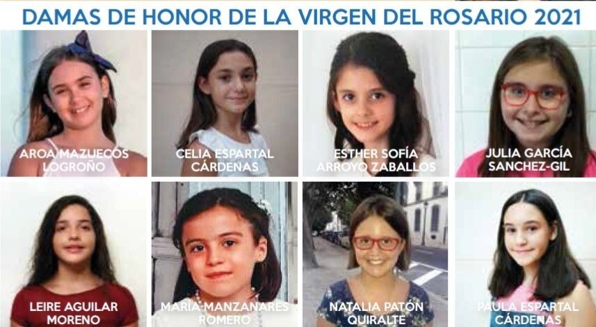 También se han elegido ya a las que serán las damas de honor de la Virgen: María Manzanares Romero, Paula Espartal Cárdenas, Natalia Patón Quiralte, Aroa Mazuecos Logroño, Celia Espartal Cárdenas, Esther Sofía Arroyo Zaballos, Julia García Sánchez-Gil y Leire Aguilar Moreno.
