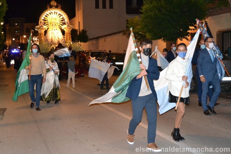 Los actos programados en Alcázar de San Juan con motivo de las Fiestas Patronales o de la Vendimia 2021, en honor a la Virgen del Rosario, han terminado esta noche con la tradicional procesión. A pesar de la constante amenaza de lluvia, con mascarillas y guardando las distancias, los miembros de la Archicofradía y devotos de la Virgen han podido salir a la calle para recorrer, junto a su imagen titular, el itinerario establecido para la ocasión, distinto al habitual, por calles más anchas y espaciadas para garantizar la separación de los participantes en la procesión.