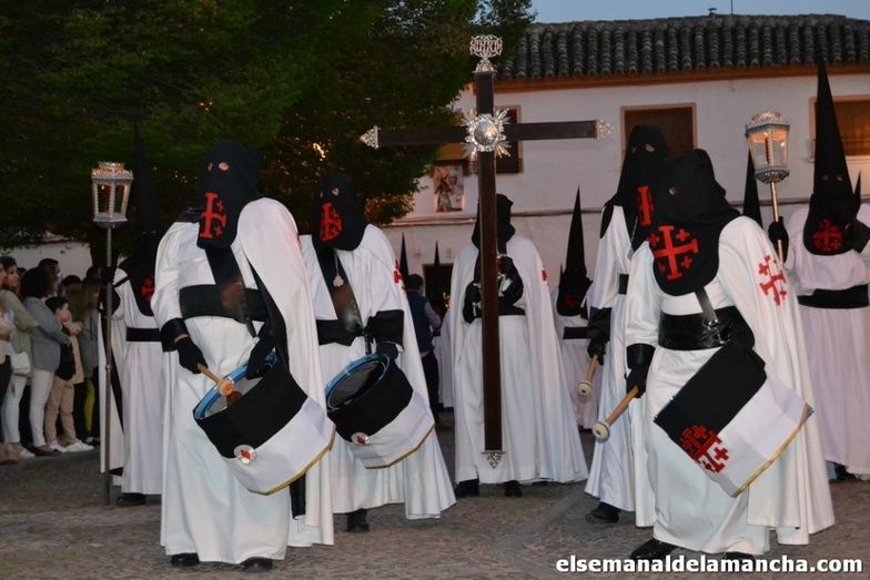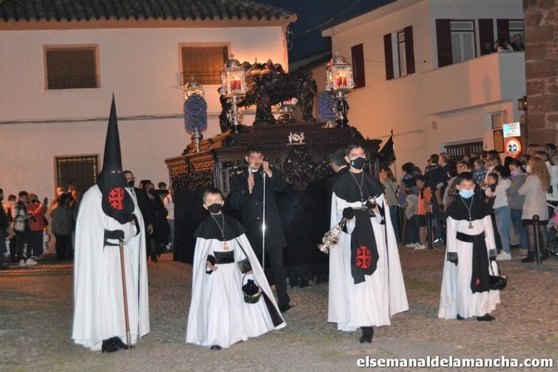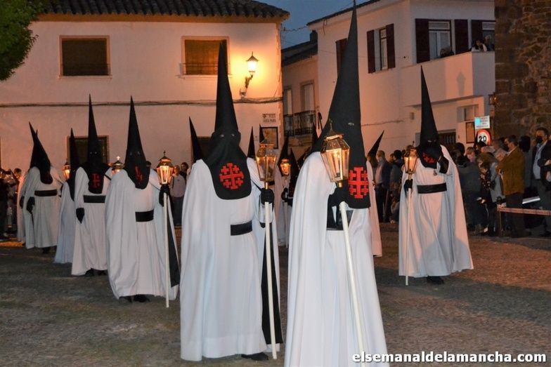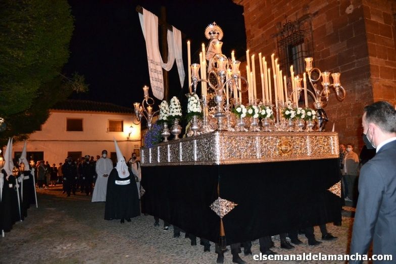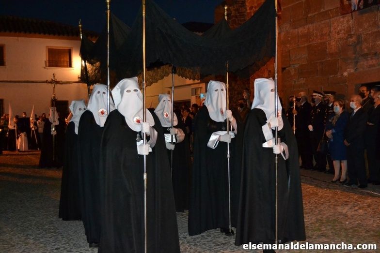 Tras varios años sin poder salir a las calles de Alcázar, a las nueve en punto de este Viernes Santo, la Antigua y Real Hermandad del Santísimo Sacramento y Cofradía de Caballeros del Santo Sepulcro, Damas de Nuestra Señora de la Soledad y de Nuestro Señor Resucitado ha salido de la parroquia de Santa María La Mayor de Alcázar de San Juan para desfilar en procesión ante una multitud de devotos apostados en la Plaza de Santa maría y calles del recorrido procesional.
