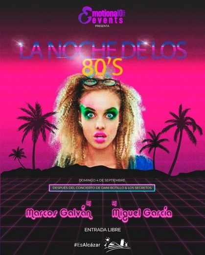 El domingo 4 de septiembre, finalizado el concierto de Dani Botillo y Los Secretos, comenzará “La noche de los 80´s” con Dj Marcos Galván y Dj Miguel García.