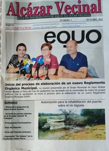 En octubre de 2016, vio la luz el primer número de ALCÁZAR VECINAL –Boletín Informativo de Equo Alcázar Vecinal – para llevar a todas las personas afiliadas y simpatizantes el trabajo realizado en el Ayuntamiento y nuestras opiniones, complementándose con artículos de opinión sobre temas de actualidad. En principio comenzamos con ocho páginas.
