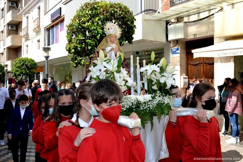 Con evidente emoción, caras de alegría y alguna que otra lágrima, la comunidad educativa del colegio Sagrada Familia de Alcázar de San Juan ha celebrado esta mañana su ya tradicional procesión de Semana Santa. Prácticamente todos los alumnos y alumnas del centro (unos 350, según los datos facilitados por la profesora María del Mar Tejado), junto a sus profesores, han desfilado por el itinerario habitual, saliendo del centro por la plaza de Santa Quiteria hacia las calles Corregidor y Ramón y Cajal, para continuar por la Castelar, Alberca Lorente, Magdaleno García, de nuevo Corregidor y vuelta al colegio.