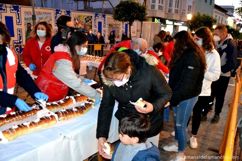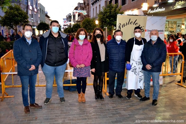 Alcázar de San Juan ha recuperado esta tarde una de las tradiciones más dulces de la Navidad y el Año Nuevo: El Roscón Solidario, una iniciativa de la Asociación Empresarial Centro Mancha (ASECEM), con la colaboración del Ayuntamiento y a beneficio de Cruz Roja, que ha convocado en la Calle Castelar a cientos de personas, dispuestas a hacer cola y guardar turno para conseguir una de las cerca de 2.000 raciones elaboradas para la ocasión por Pastelería La Rosa.