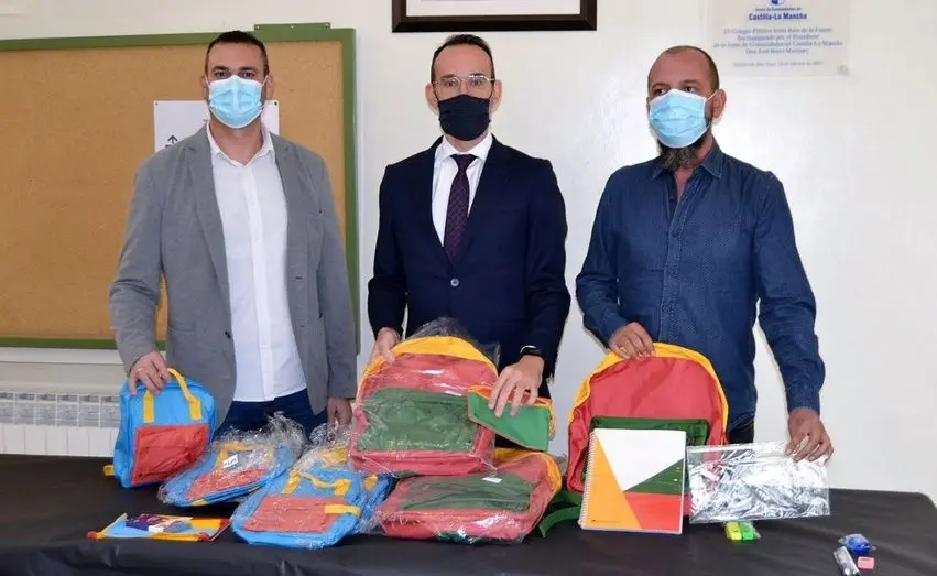 El director de la oficina de La Caixa en Alcázar de San Juan, Raúl Peralta, ha entregado esta mañana al concejal de Educación, Mariano Cuartero y al director del colegio público Jesús Ruiz, Miguel Ángel Cartas, 150 mochilas cargadas de material escolar destinadas a las familias más vulnerables del municipio.