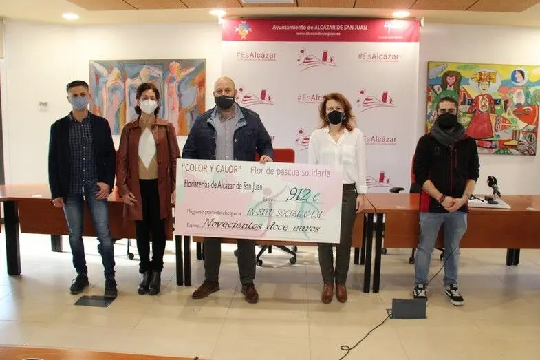 Las cuatro floristerías precursoras de la iniciativa solidaria “Color y calor”, han entregado este miércoles en el ayuntamiento de Alcázar de San Juan, un cheque solidario por valor de 912 euros a In-Situ Social, con la presencia de la concejala de Servicios Sociales, Patricia Benito.