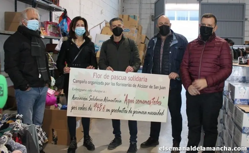 La iniciativa de la Flor de Pascua Solidaria, puesta en marcha por segundo año consecutivo por parte de las cuatro floristerías de Alcázar de San Juan, ha conseguido una recaudación de 948 euros, que irán destinados a la asociación sin ánimo de lucro “Aquí comemos todos”, y cuyo cheque simbólico (ya que la asociación no recibe nunca dinero, sólo producto) se ha entregado este jueves en la sede de la asociación, con la presencia de los responsables de las floristerías, el presidente de la Ong y el concejal Pablo Pichaco.